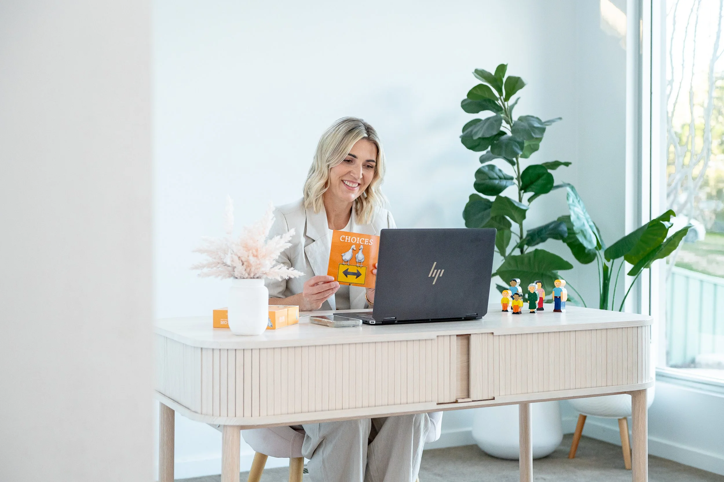 Woman sitting at a light-colored desk with a laptop, holding a card that says 'Choices' with ducks and arrows, surrounded by a plant, small figurines, and decorative items, in a bright, modern office.