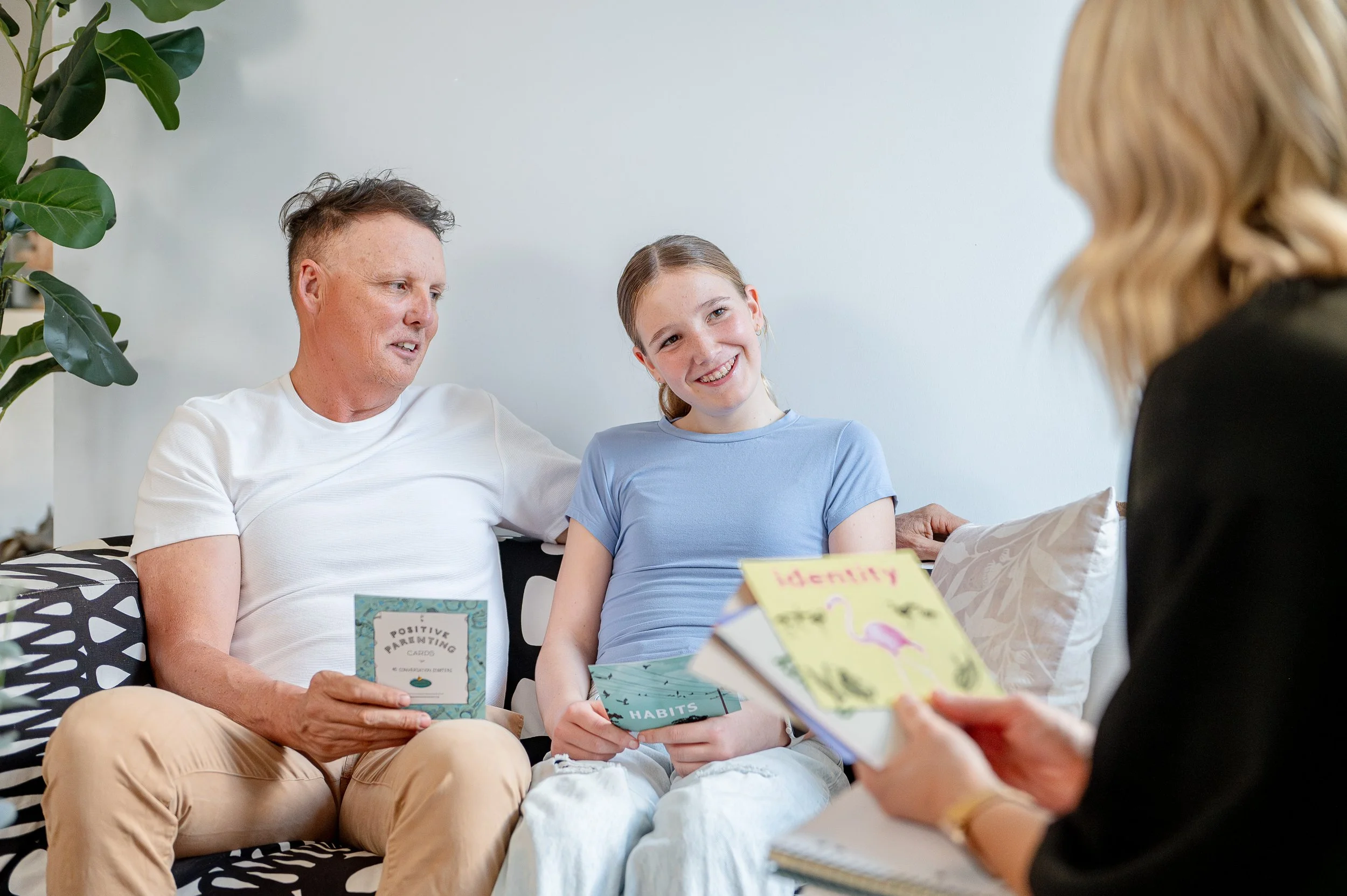A young girl and a man sitting on a couch, smiling during a counseling session with a therapist, who holds a book titled "Identity".